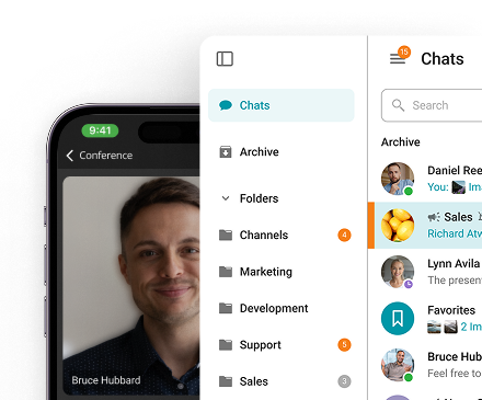 Принимайте вызовы и участвуйте в конференциях на любых устройствах, сохраняя непрерывность общения — история чатов будет синхронизирована автоматически.